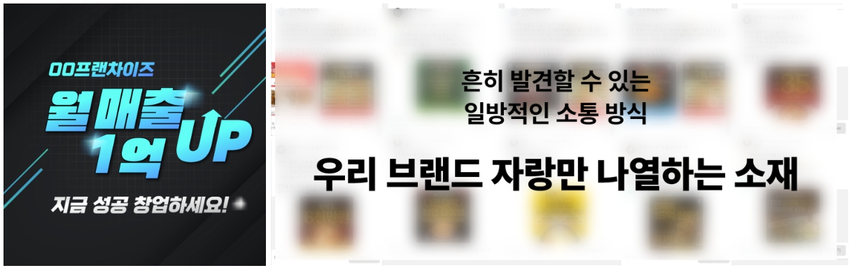 실제로 외식업 창업에 관심있는 분이라면 이러한 카피들을 질리도록 봤기에 관심도 안 가지거나, 관심이 있어도 타 브랜드로 잘못 기억하거나 오히려 숫자만으로 타 브랜드와 비교해보게 되는 요소를 제공하기도 합니다.